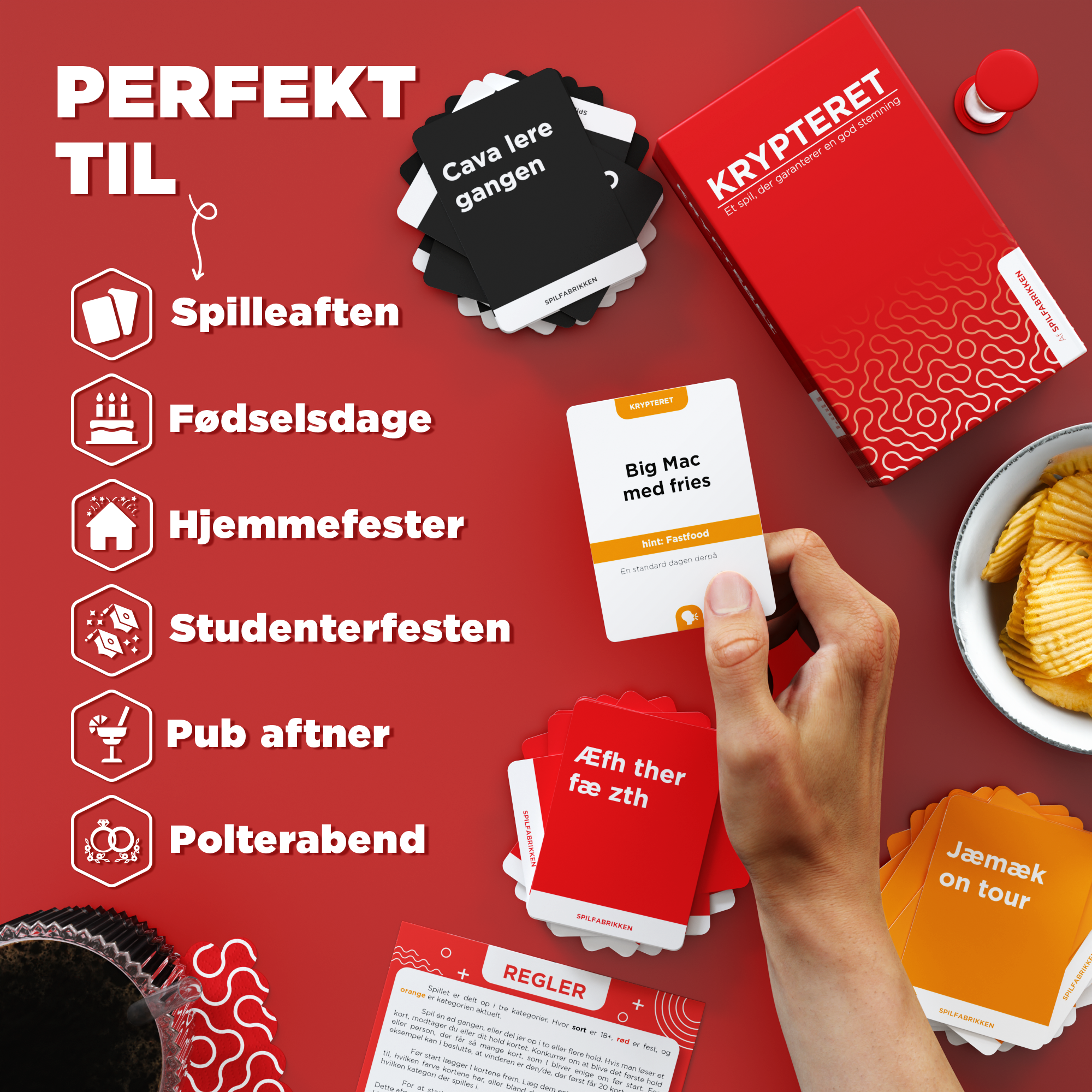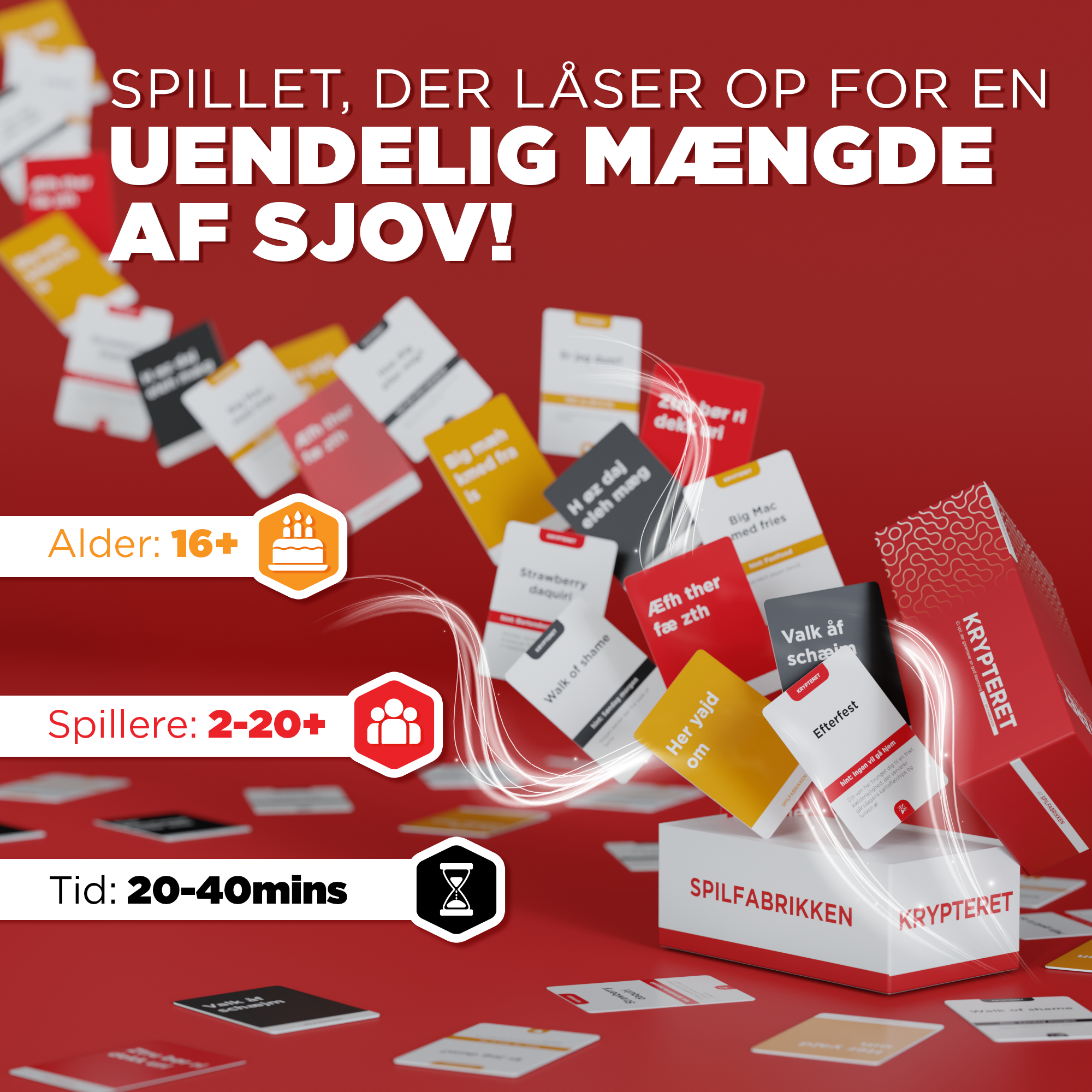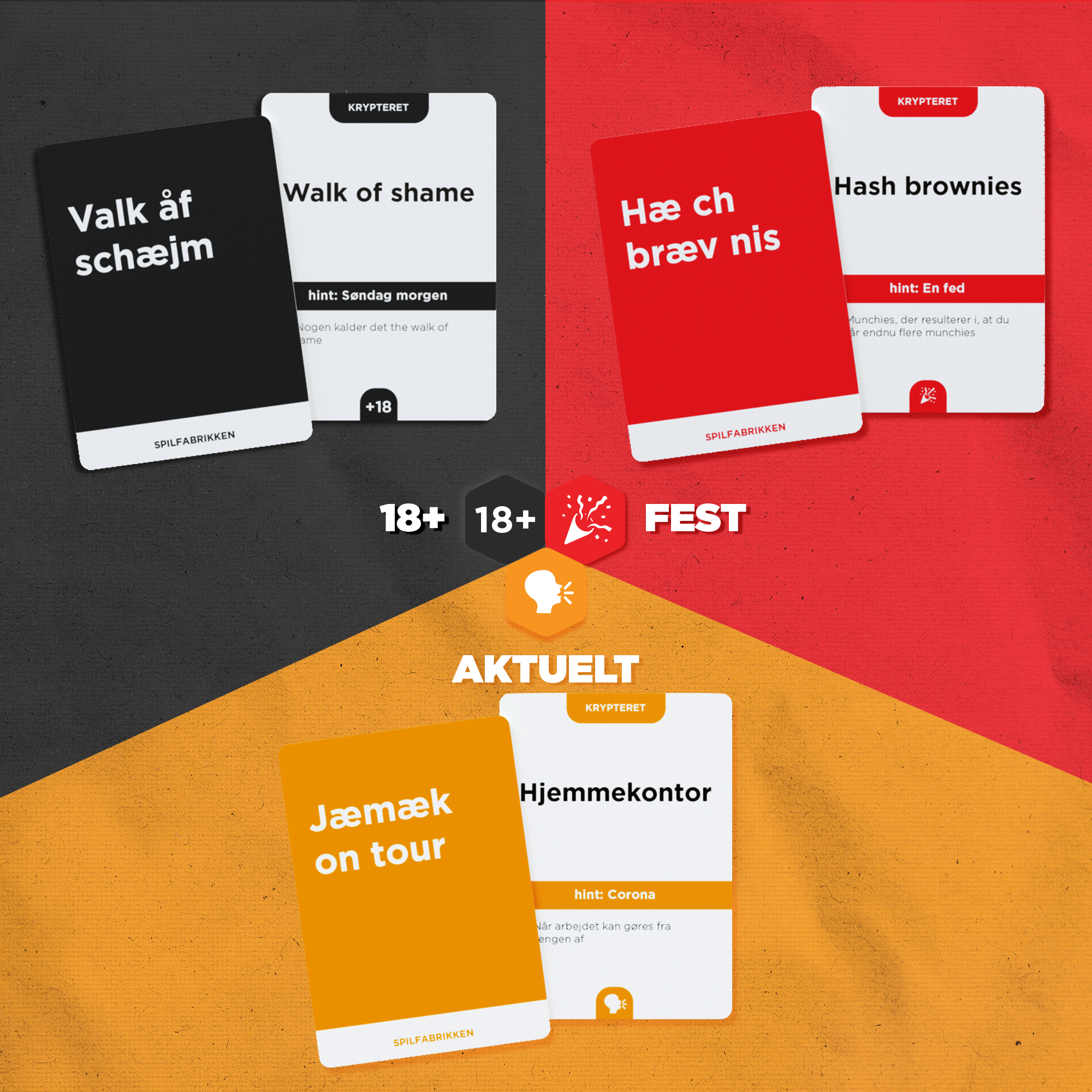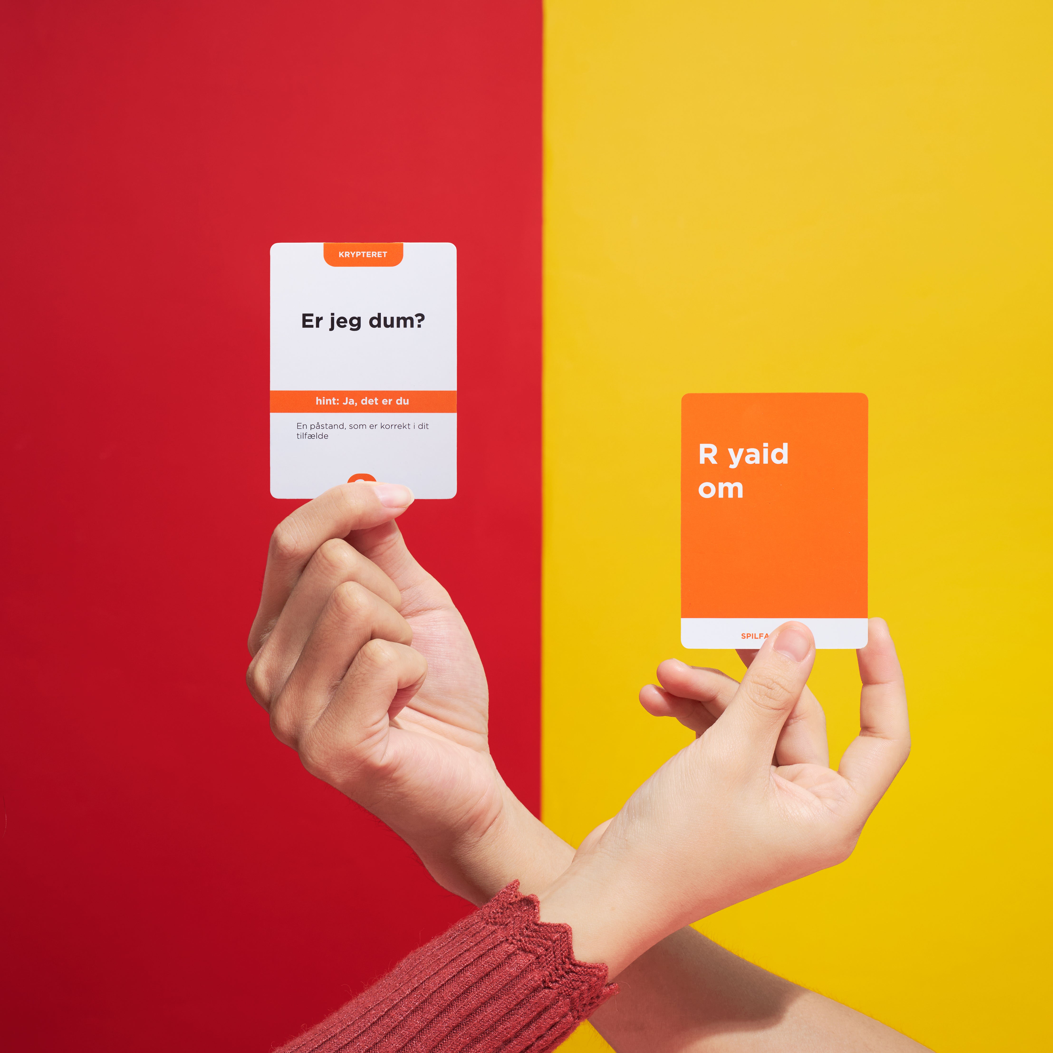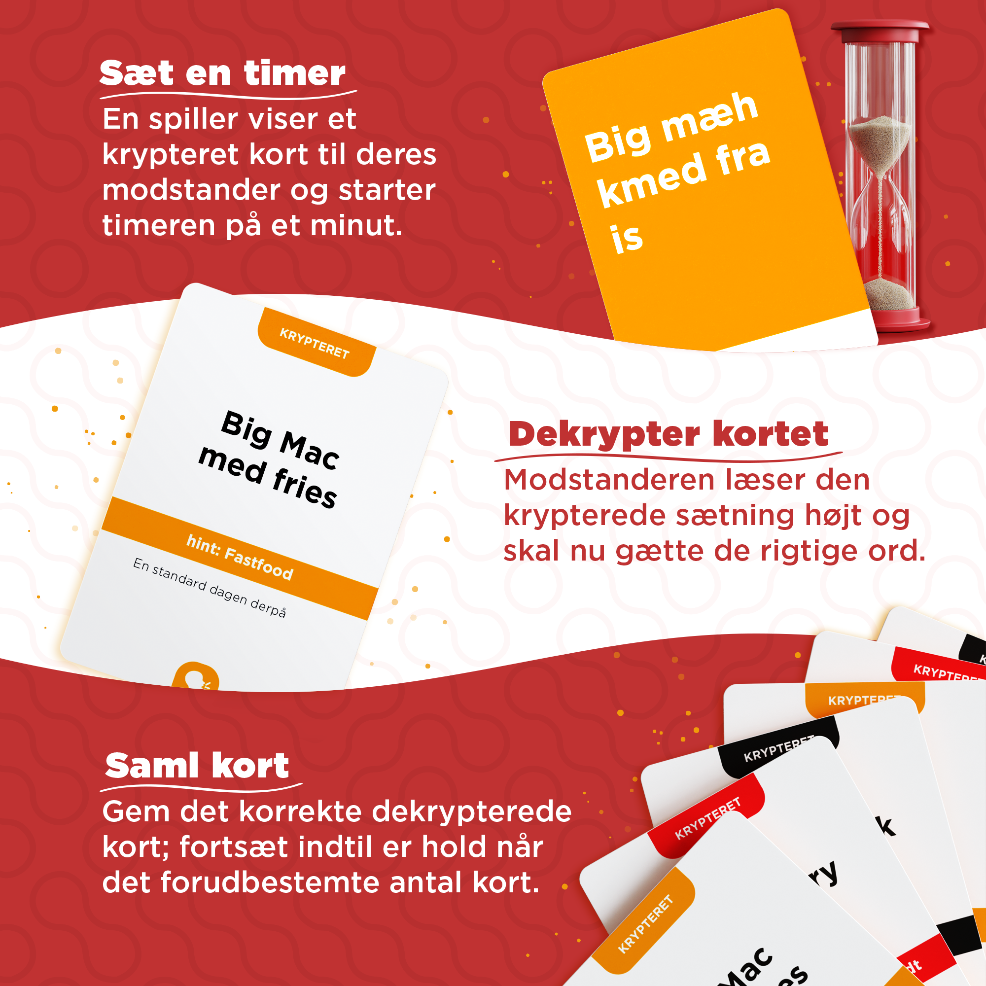 - Del jer op i hold eller spil én efter én. Dekrypter så mange kort som muligt, før tiden løber ud. Spillet indeholder timevis af festlige, dyre og underlige kort!